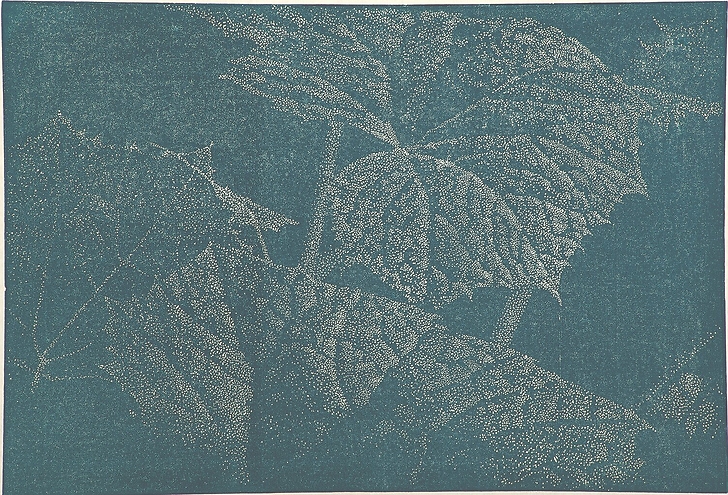 Franz Gertsch's paintings, executed from photographs, play with scale and reproduce only certain details, to modify and counteract the effects of realism. Gertsch's woodcuts, which are generally very large in format, follow the same artistic logic. He uses the "criblé" technique, in which a gouge is used to prick the matrix with tiny dots, recreating the form without contour lines or shadows. This coding of the image, similar to an underlying but perfectly visible weft, serves to confuse and distance the subject represented. Perstwurz III is one of a series of engravings depicting enlarged butterbur leaves. The plant's name derives from the analogy between the shape of its leaves and the petasus, the flared-brimmed hat worn by Mercury. While the woodcut technique achieves a very delicate effect, the focus on the leaf evokes the way these perennial plants can prove invasive in damp environments.