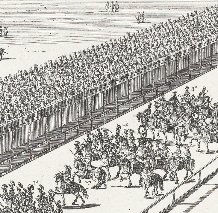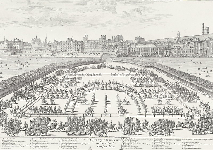 The first plates commissioned by Colbert fix for history the Grand Carrousel, a superb celebration offered to the Parisians on 5 and 6 June 1662 on the occasion of the birth of the Dauphin. Five quadrilles paraded from the rue de Richelieu to the Tuileries...