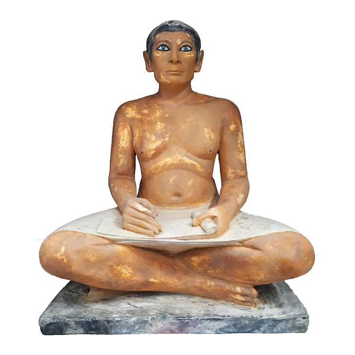 Seated Scribe, 4th or 5th dynasty, 2600-2350. Paris, Louvre Museum. Original in polychrome limestone.
