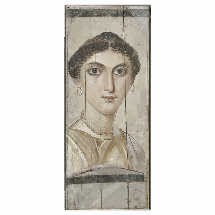 The portraits discovered in the Fayoum region bear witness to this astonishing cohabitation between Egyptian funerary practices, the Roman world, and the still strong Hellenistic influence. Painted mainly on wooden panels or on linen canvas, in wax or tempera, these portraits make it possible to identify the deceased, and indicate his or her sex, age and social status. Jewellery can be used as dating criteria, with some models being influenced by contemporary fashion while others remain more timeless. The earrings worn by this young woman are made of three white pearls strung on a gold wire that forms a ring, the end of which descends behind the lobe. Her necklace is a golden twist at the neck.