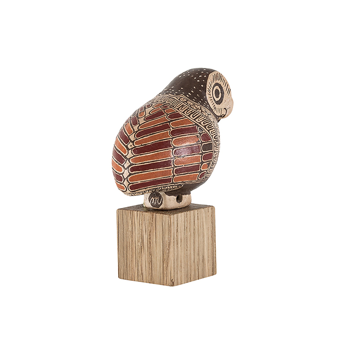 This type of small vase, named Aryballe, was used in ancient Greece to put olive oil on naked athletes to protect them from the sun during competitions. The body of the animal serves as a reservoir and a small hole in the tail allows the liquid to flow out. The shape adopted for the vase varies according to the wishes of the recipient. For this aryball, the owl refers to the deity Athena, goddess of wisdom and warrior intelligence.