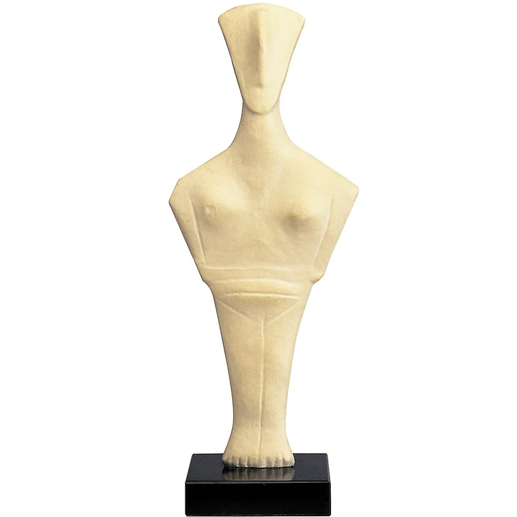 This statuette of a nude woman, standing on tiptoe, in a frontal position, arms crossed over her body, is the reproduction of an original in marble from Naxos, one of the islands of the Cyclades. This statuette is typical of the artistic production of these islands during the prehistoric period of the Early Bronze Age (3200-2000 B.C.). Thanks to their geographic position, between Anatolia and the Greek continent, the Cyclades were instrumental in circulating technical innovations from one region to another, and thus provided fertile ground for their art to flourish during a certain period. Contrary to the naturalism of the Neolithic Age, the artists of these islands created a geometric art. Their marble idols are probably the most perfect form of this type of art, dominated by abstraction, harmonious proportions, and pure volumes and lines.