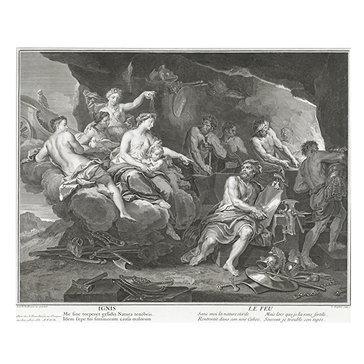 Here, Louis Desplaces (1682-1739) depicts fire as a force for construction and passion. He took his inspiration from an episode in Canto VIII of the Aeneid. In it, Venus asks her husband Vulcan to forge the military equipment for her son Aeneas. The god is shown at work in his forge, where the Cyclops are busy, illuminated by the flames. He is facing Venus, who seems to be glowing in contrast to the dark cavern that surrounds them. He looks at her with admiration and passion, and already seems to be giving in to her, demonstrating the power of love, a power often expressed in the 18th century by the word "fire"...