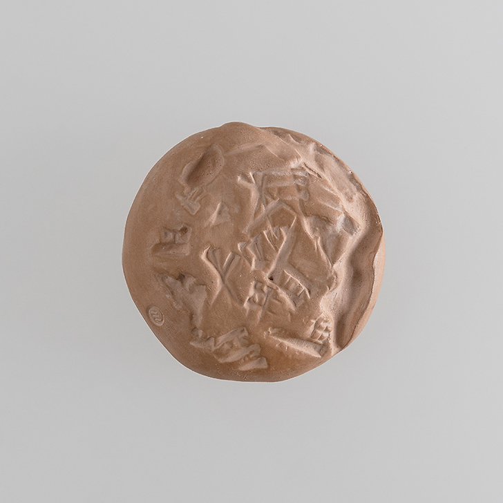 This rather crude form of writing tablets, shaped by the apprentice scribe, has three lines of writing of the master's hand. The student tried to copy some signs, below and on the reverse, with an obvious blunder.