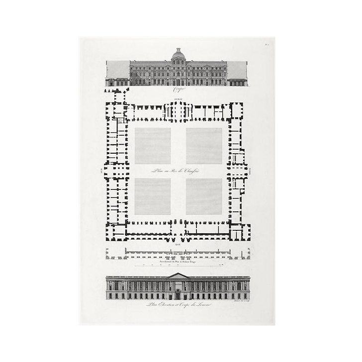 It is within this framework of documentation that this print is set, showing a plan and two sections of the Louvre, a culturally and politically emblematic monument of the city, transformed into a museum after the Revolution.