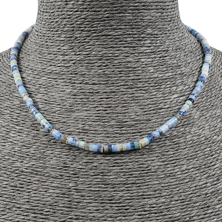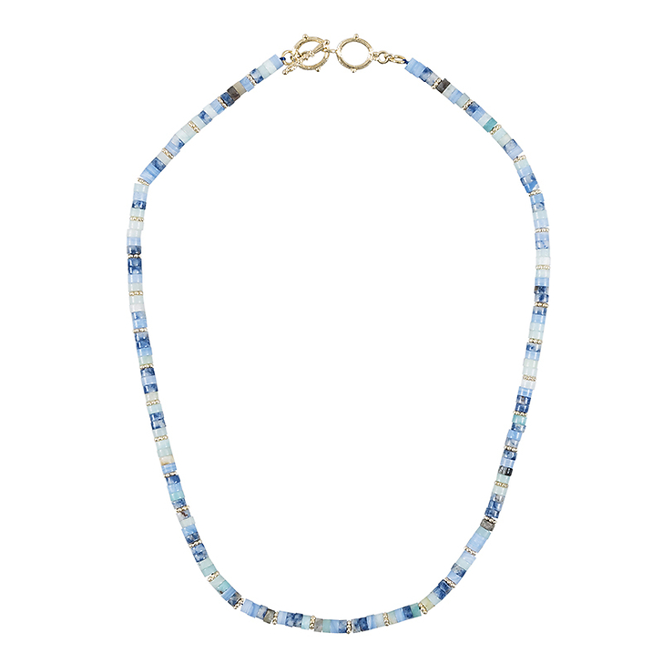 This necklace made of fluorite, sodalite and gilded brass beads is inspired by a so-called Bactrian necklace with small cylindrical lapis lazuli beads combined with thirty gold beads and a rod-shaped pendant bearing two discs (Bactria, -2100 / -1900 (2nd half of 3rd mill BC (?)).