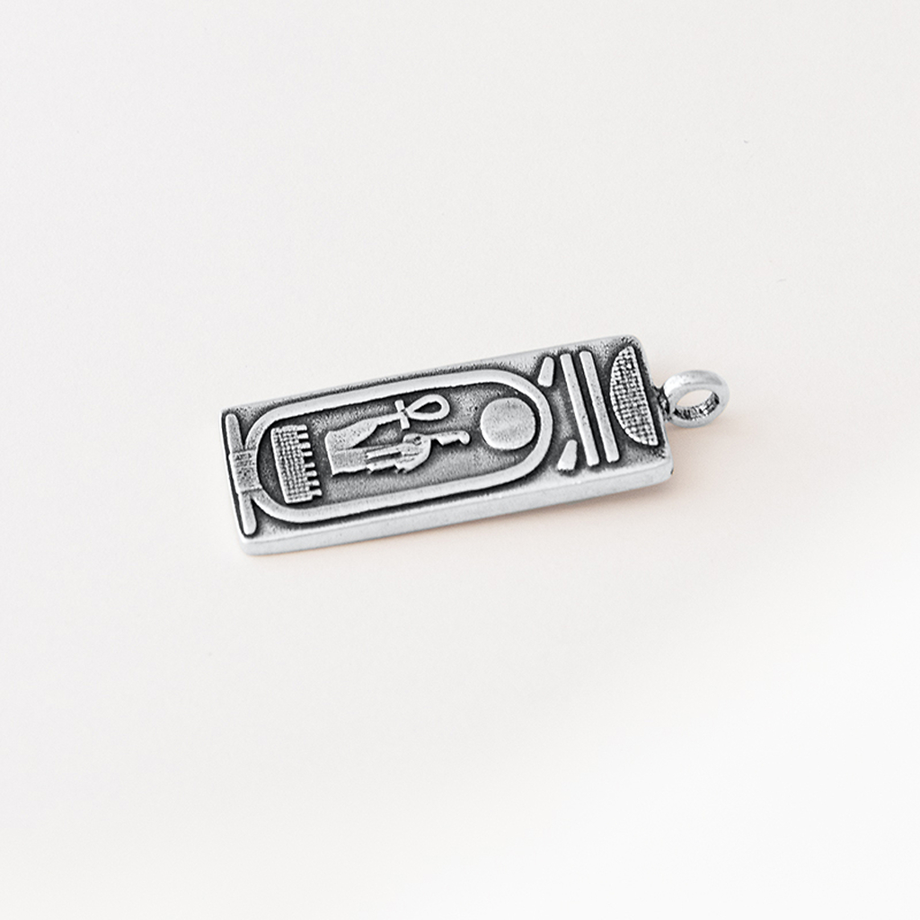 The kings of ancient Egypt traditionally had five names, which together composed their royal titulary. These names included Horus, which placed the royal office holder under the protection of the eponymous falcon god; Nebty, which placed the king under the protection of the two goddesses of Upper and Lower Egypt; the Golden Horus, which associated the king with the sun god and his prosperity; the throne name, adopted by the king at his accession to it; and the monarch's birth name, which is what they are known by in the present day. The word on this cartouche - Menmaatre - is the throne name of Seti I, the Ruler of Two Lands. Its meaning approximates 'stable is the cosmic order of Ra'.