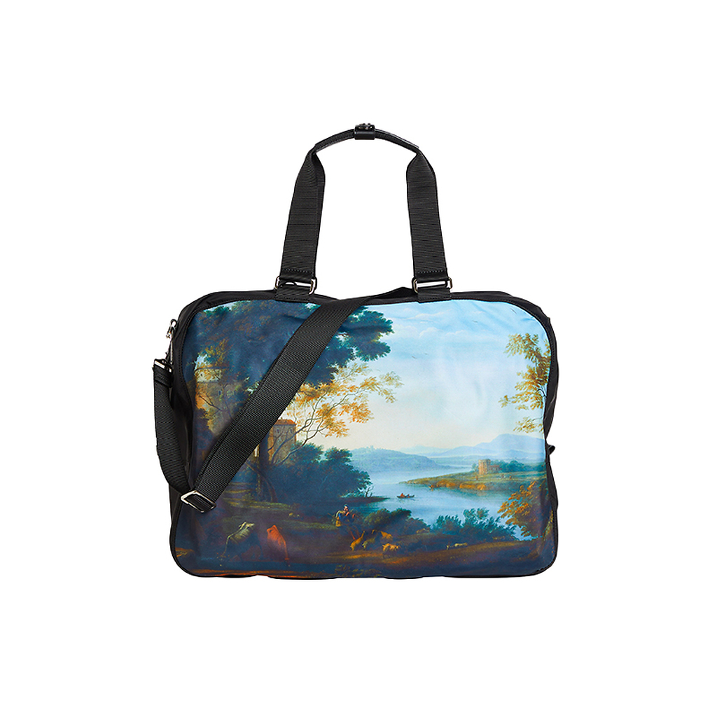 Boston bag in polyester, digital print with "Port de mer au soleil couchant" on one side and "Paysage avec un berger" on the other, after Claude Gellée, around 1639.