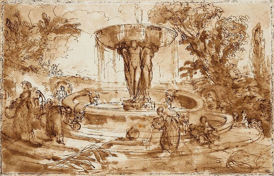Women and children near a fountain, decorated with a basin