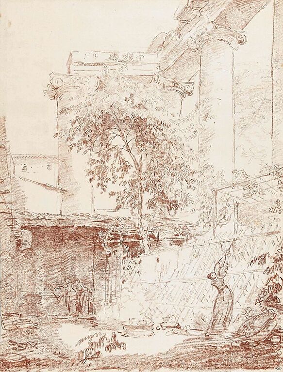 Woman hanging laundry in a courtyard (art prints)