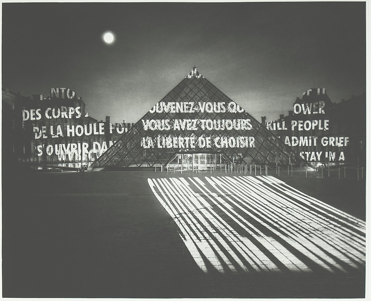 Influenced by minimal and conceptual art, Jenny Holzer's work is built around writing, sculpture and architecture. She broadcasts her own texts in public spaces, particularly through the use of LEDs. Her media can be as diverse as electronic signs, posters, T-shirts, cars, or monuments from all over the world. For her, art must exist at street level and be accessible: "I used language because I wanted to offer content that people - not necessarily art people - could understand." Adopting the form and language of marketing, her powerful writing forces the passive audience to adopt a critical stance. Commissioned by the Festival d'Automne in Paris in 2001, she created a series of projections on various monuments, including the Louvre. The heliogravure produced for the occasion bears witness to this, but is primarily a work of art in itself: the artist has retouched the plate, notably by adding the moon.