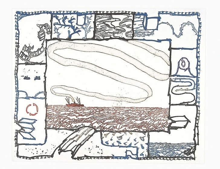 Pierre Alechinsky was born in 1927 in Brussels. Painter and engraver Pierre Alechinsky first trained in typography and illustration at the La Cambre school in Belgium, before becoming a founding member of COBRA, an artistic movement of Nordic origin (acronym for Copenhagen, Brussels, Amsterdam) advocating artistic spontaneity. His art is based on a constant attention to text, both poetic and literary, and on an ornamental vocabulary derived from calligraphy, in which the sign becomes meaning and form. The ship lost on this immense sea, leaving a wide trail in the sky, in the central scene of Le Pinceau voyageur is a poetic invitation to travel and elsewhere. It is also an evocation of the artist's unfinished and ever-renewed journey, equipped only with his imagination and his brushes, while the scenes placed in frames on the periphery constitute the various stations punctuating this dreamlike voyage.