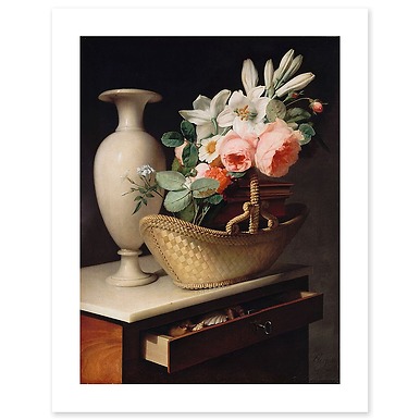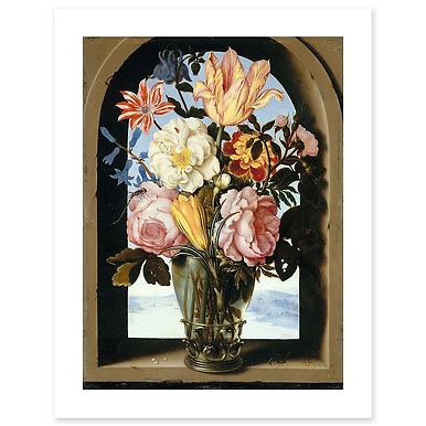 Bouquet of flowers in a stone frame opening onto a landscape (canvas without frame)
