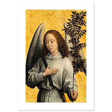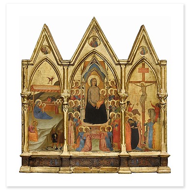 Tryptique fixe. Au centre : La Vierge et l'Enfant entourés de vingt anges et de quatre saints (Jean-Baptiste, Pierre, Paul et Laurent [']), à gauche : La Nativité, à droite : La Crucifixion (canvas without frame)