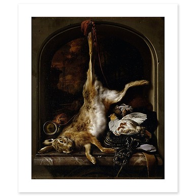 Game and hunting utensils arranged on a window sill (canvas without frame)