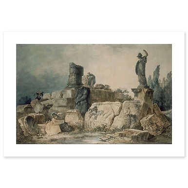 Two young women drawing in an ancient ruin site (canvas without frame)