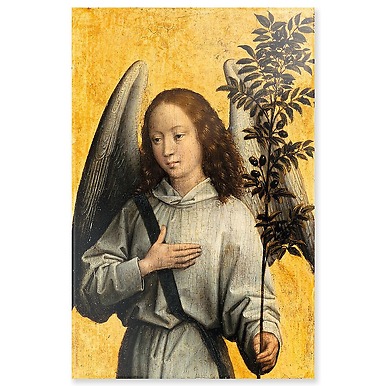 Tryptique fixe. Au centre : La Vierge et l'Enfant entourés de vingt anges et de quatre saints (Jean-Baptiste, Pierre, Paul et Laurent [']), à gauche : La Nativité, à droite : La Crucifixion (acrylic panels)