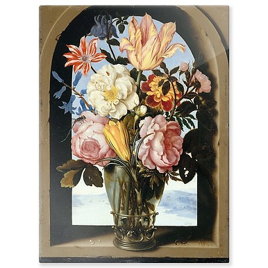 Bouquet of flowers in a stone frame opening onto a landscape (aluminium panels)