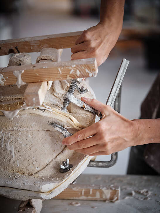 Une fois l'œuvre enveloppée d'élastomère, les artisans élaborent des chapes de plâtre, qui tiendront la matière lorsque l'ensemble sera démoulé. Ces dernières sont elles-mêmes soutenues par un châssis en bois, qui permet une manipulation plus sécurisée. Dernière étape de ce processus minutieux, le démoulage qui libère le modèle original.
