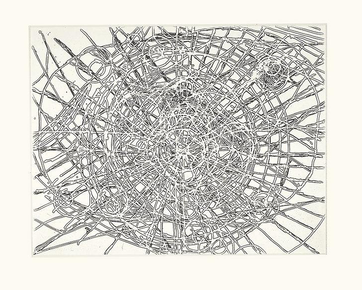 « L'espace informationnel existe. Il n'est pas immatériel mais incorporel. Je m'intéresse à la manière de donner une image de ces choses que nous ne pouvons pas voir. » Si l'art de l'artiste américain Terry Winters a toujours été profondément marqué par l'expressionnisme abstrait, cet artiste a cherché à se dégager d'un certain formalisme, notamment en prenant comme modèle de sa démarche artistique les évolutions de la pensée scientifique contemporaine. Dans les années 1980, il s'inspira dans ses compositions de radiographies anatomiques prises par rayons X, avant de s'intéresser à la cybernétique et aux connexions neuronales. L'estampe qu'il créa pour la Chalcographie, maillage de fils entrelacés qui semble s'étendre au-delà de la composition, évoque aussi bien des structures interconnectées et rhizomiques des réseaux informatiques, que des plans des mégapoles dans lesquelles les axes de circulation se développent à l'imitation des toiles d'araignées. Cette composition abstraite permet ainsi, selon les mots même de Winters, d'imaginer ce que l'on ne peut voir autrement.