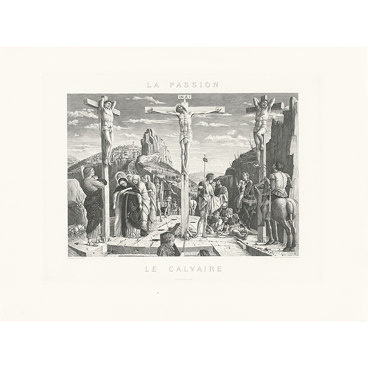 Gravées par Achille Jacquet d'après le peintre André Mantegna, cette planche de la Crucifixion fait partie d'un triptyque. Les 3 planches ont été imprimées sur une seule et même feuille de Japon à l'occasion de l'Exposition universelle de 1900. Tirées à 200 exemplaires, cette composition est considéré comme le « clou de la Chalcographie Nationale ». L'état en commande plusieurs exemplaires sur satin, pour en faire cadeau à des personnalités importantes en 1903-04: la reine de Grèce, M. Credler, Commissaire Général américain de l'exposition universelle de Saint-Louis par exemple.