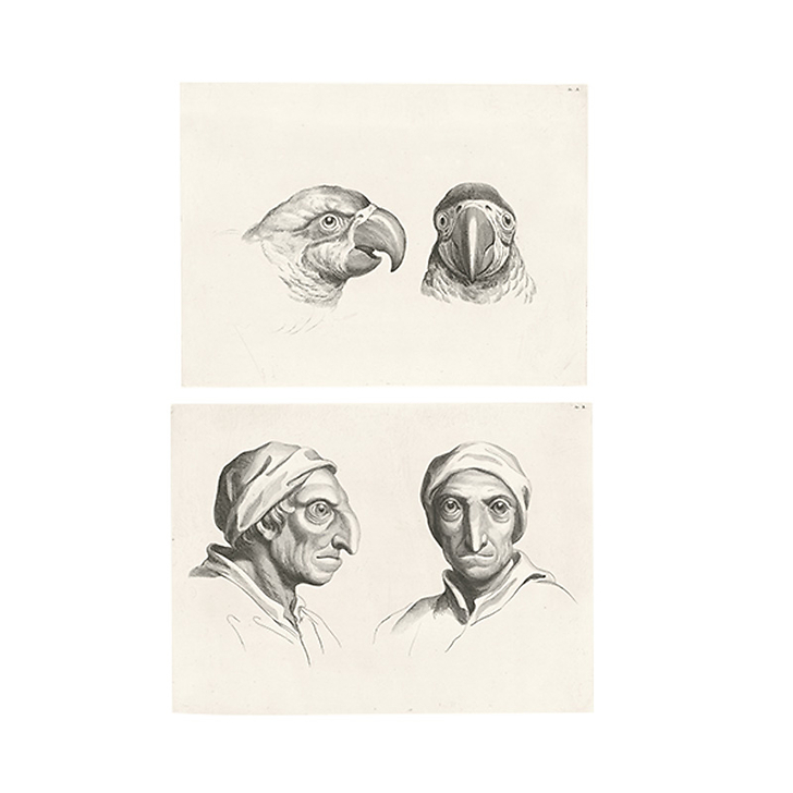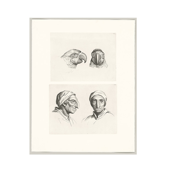 Estampe Deux têtes de perroquets et deux têtes d'hommes