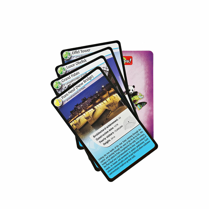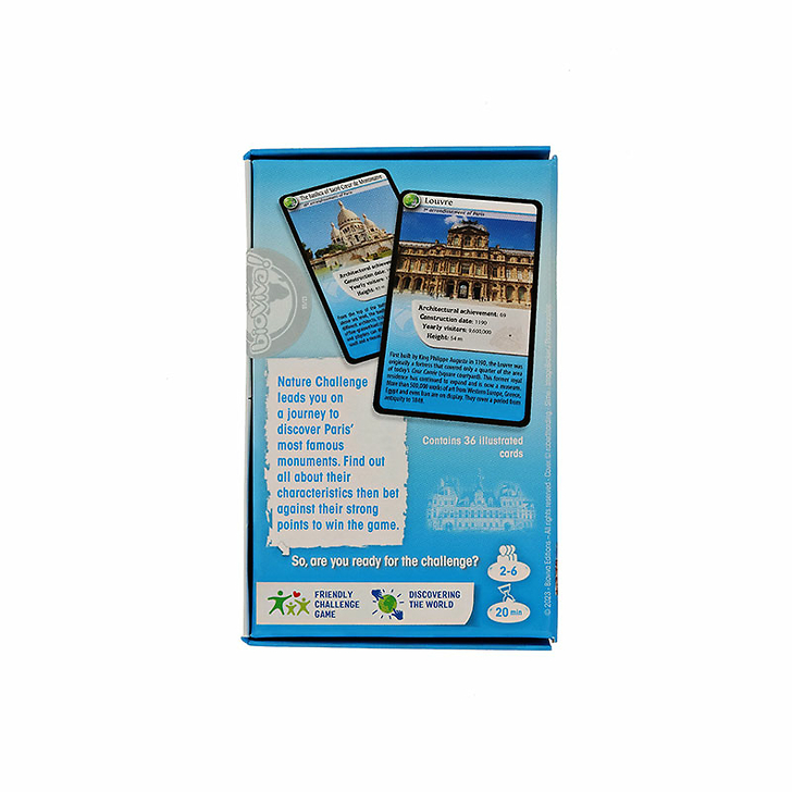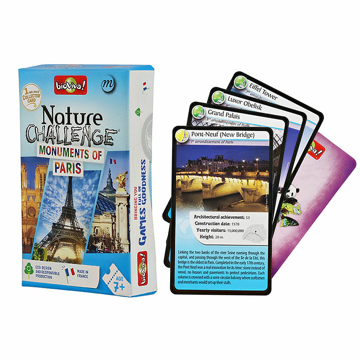 Véritable phénomène de cour de récré, les jeux de cartes Défis Nature, permettent aux petits comme aux grands de mieux connaître le monde qui nous entoure. Dans cette nouvelle référence de la collection, les enfants découvrent de célèbres monuments parisiens et leurs caractéristiques (« prouesse architecturale », « date de construction », « nombre de visiteurs par an » et « hauteur »).