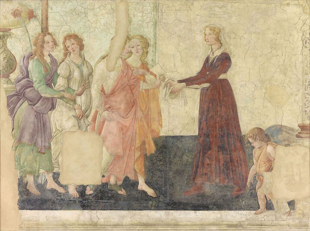 Œuvre de : Botticelli Sandro Hauteur de l'original : 211,00 cm Largeur de l'original : 283,00 cm Période : période moderne - Renaissance, 15e siècle Technique : fresque (technique) Botticelli Sandro - Vénus et les Grâces offrant des présents à une jeune fille - fresque (technique) Photo © RMN-Grand Palais (musée du Louvre)