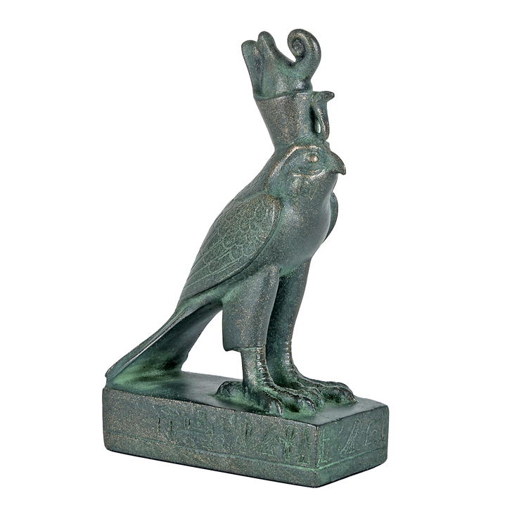 Horus est aussi figuré sous les traits d'un homme à tête de faucon. En tant que faucon, il est le grand dieu du ciel, ses yeux sont le soleil et la lune. Il est également dieu solaire sous le nom de Ré-Horakhty. Très ancien dieu d'Hierakonpolis, honoré depuis la Préhistoire, il est un dieu royal, protecteur du roi ; Pharaon est son représentant sur le trône d'Egypte (un des cinq noms qui composent la titulature royale est précisément le Nom d'Horus).