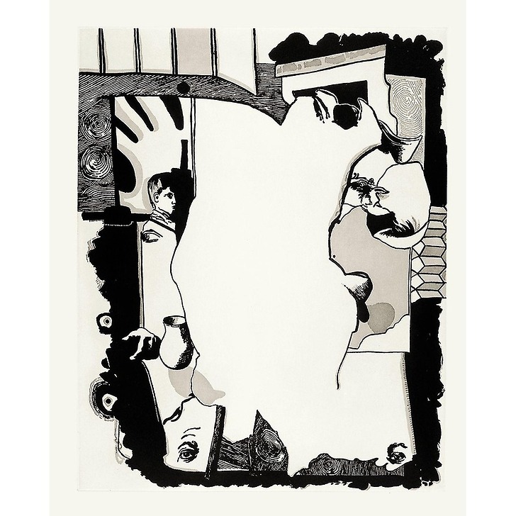 L'œuvre de Jean-Michel Alberola s'inscrit dans une tradition esthétique libertaire qui, tout en multipliant un art du collage et de la citation des grandes œuvres picturales ou littéraires, les détourne et les travestit pour créer des effets de sens. Ce travail cherche ainsi à la fois à se prémunir de l'attraction des images, mais également à se les réapproprier pour leur donner une nouvelle force. Le tableau du Repas des paysans, peint par les frères Le Nain en 1642, fut fréquemment reproduit pour devenir l'archétype du monde paysan de l'Ancien Régime. Dans sa gravure, Alberola cherche à démonter cette image pour souligner les éléments iconiques qui la composent. La partie centrale rappelle la nappe blanche autour de laquelle se répartissent les personnages, tandis que le pain et le pichet posés sur la table, le jeune garçon debout qui nous regarde, la cheminée, le chapeau de l'un des personnages constituent les éléments décentrés de cette scène.