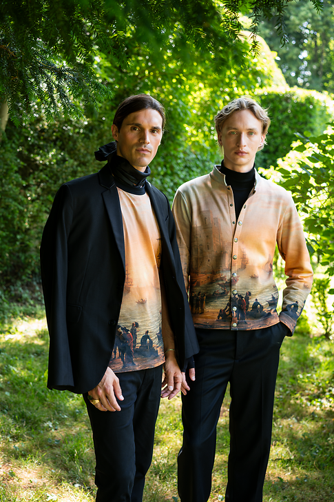 Pour cette nouvelle collection, Agnès b. a choisi deux tableaux du peintre classique Le Lorrain, célèbre pour ses paysages imaginaires inspirés de la campagne romaine et de la mythologie antique.