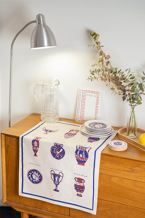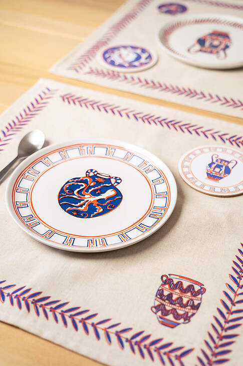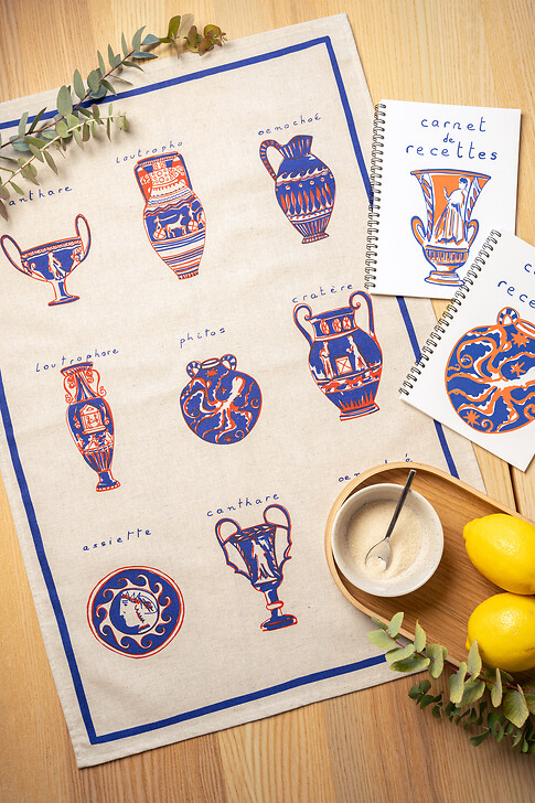 Blandine raconte en dessin la richesse visuelle des terres-cuites antiques à travers une série d'objets, de textile et d'accessoires en papier pour composer une table solaire et joyeuse.